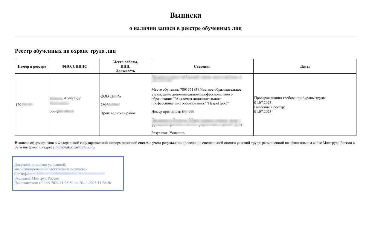 По окончании курса выдаётся удостоверение установленного образца, подтверждающее прохождение обучения и готовность к выполнению профессиональных обязанностей в сфере охраны труда.